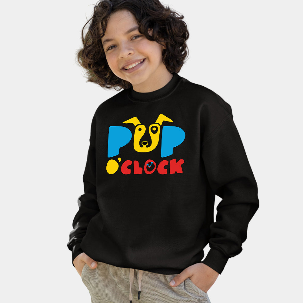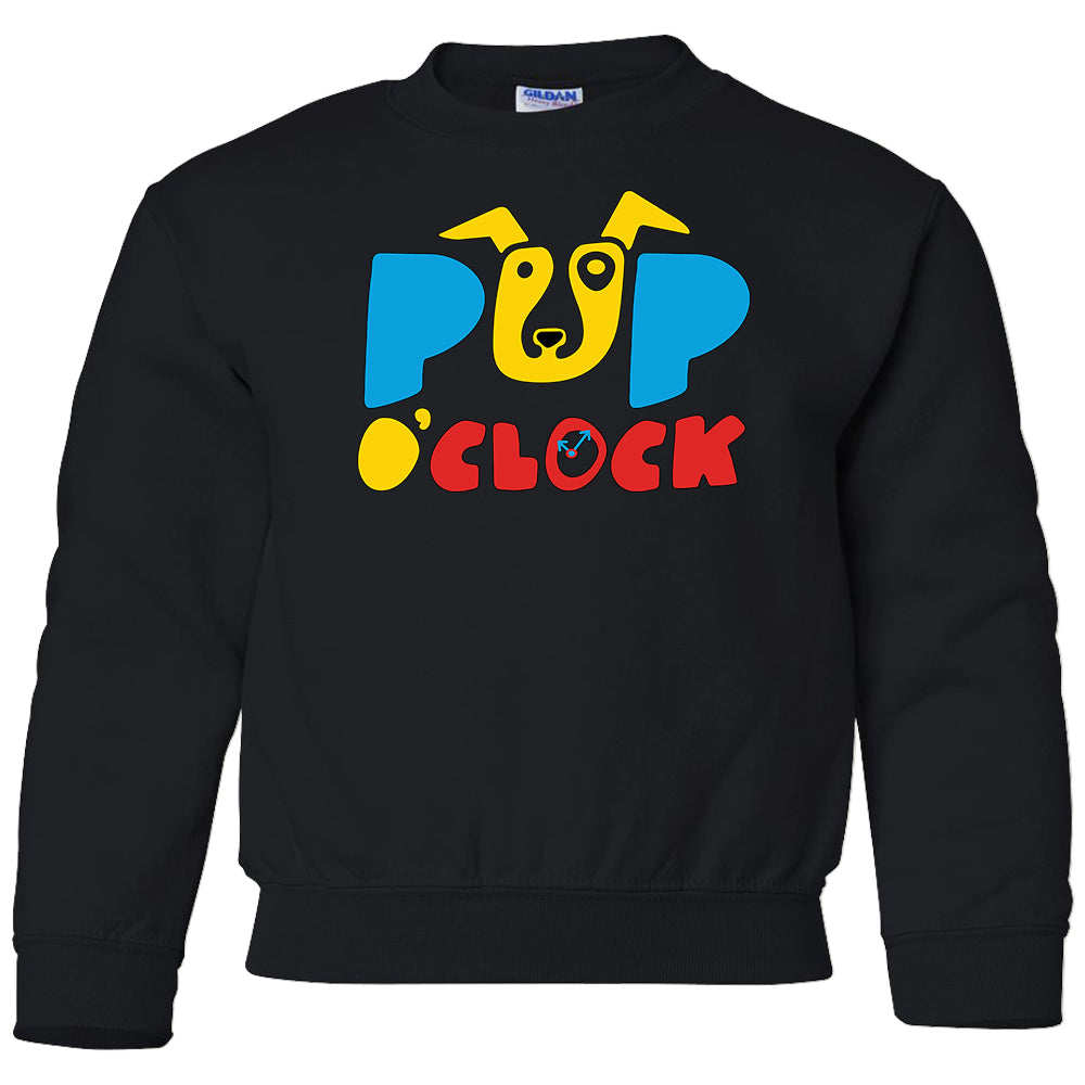 Youth black sweatshirt sporting the stacked Pup O'clock logo and made with an 8oz 50% cotton and 50% polyester blend.